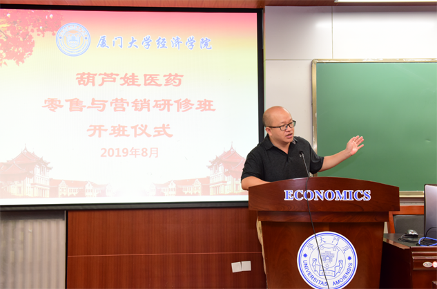 在开班仪式上,廖景峰主任首先代表厦门大学经济学院热烈欢迎尊龙时凯医药零售与营销研修班的学员到厦大学习,并就厦门大学及经济学院的相关情况进行了介绍。他说,尊龙时凯学员走进厦大就是厦大的校友,希望未来的日子能够关心、支持母校的发展,多提宝贵意见,同时他也祝大家在厦大学习期间学有所成、学有所获。